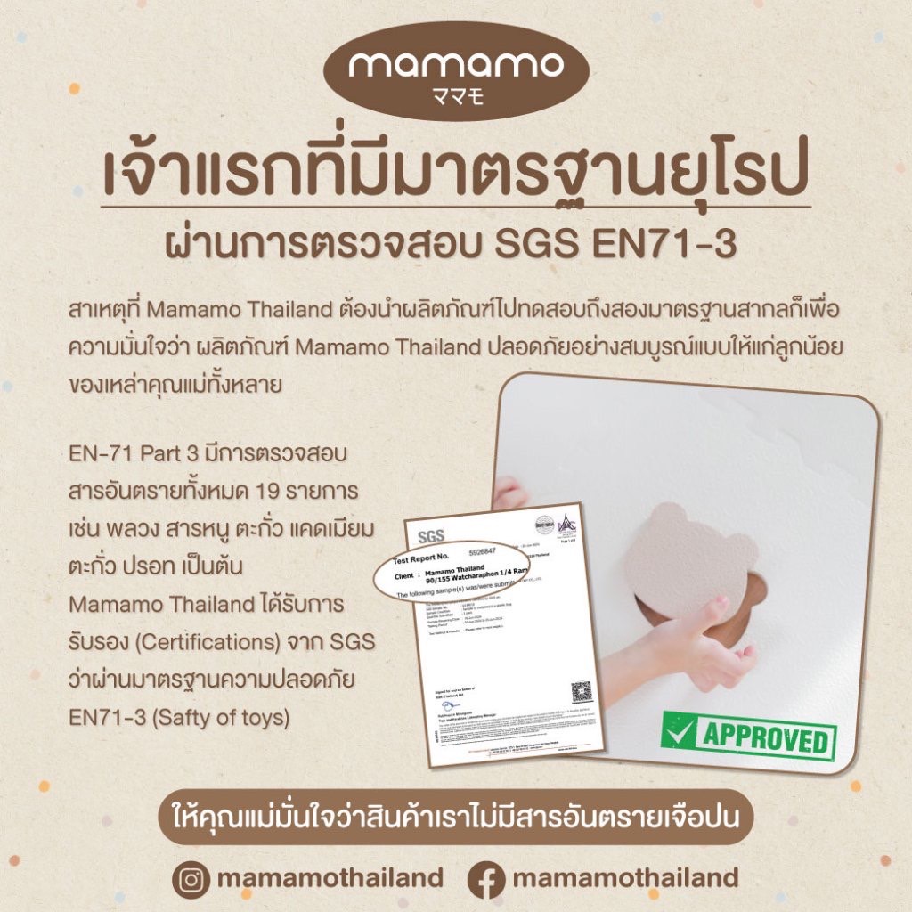แผ่นรองคลาน Mamamo Thailand เป็นเจ้าแรกที่มีมาตรฐานยุโรป ได้ผ่านการตรวจสอบ SGS EN71-3 ที่ได้รับการยอมรับอย่างแพร่หลายในสหภาพยุโรป มีจุดประสงค์เพื่อทดสอบของเล่น และชิ้นส่วนของเล่นที่มีโอกาสเข้าปากเด็ก อายุไม่เกิน 6 ปี